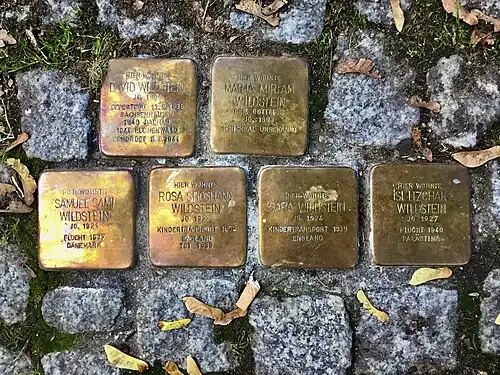 - ↑ N. M.: Stolpersteine de la famille Wildstein, Berlin. Kleine Auguststr 10 Berlin. In: Cercle Shoah d’étude de la Déportation et de la Shoah. 6. Oktober 2020, abgerufen am 30. Dezember 2020.