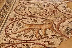Ursprünglich war der ganze Boden mit Mosaiken bedeckt, davon waren aber bei Entdeckung des Gebäudes nur mehr Reste im südlichsten Seitenschiff und im Mittelschiff erhalten.