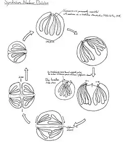 Im Gegensatz zu anderen Dinoflagellaten verfügt Syndinium wie auch die anderen Mitglieder der Ordnung Syndiniales nicht über das herkömmliche Dinokaryon oder den damit verbundenen Prozess der Dinomitose. Stattdessen besitzen Syndinium-Vertreter weniger, aber größere Chromosomen als die meisten anderen Dinoflagellaten, nämlich nur 4 im Vergleich zu den sonst typischen 20 und mehr.[35]Syndinium zeichnet sich durch mitotische Kernteilungsmechanismen aus, bei denen die Kinetochoren an der Kernmembran befestigt sind und die damit verbundenen V-förmigen Chromosomen durch axial ausgerichtete Mikrotubuli voneinander weggeschoben werden.[36] Diese Methode der Kernteilung ist bei Dinoflagellaten zwar nicht ganz selten, wurde aber erstmals bei Syndinium untersucht.