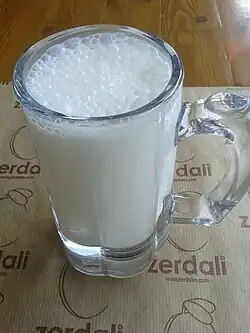 Zu den Gerichten wird häufig Wasser getrunken, aber auch Fruchtsäfte wie Orangen-, Granatapfel- oder Zitronensaft, letzterer mit Minze. Wie die türkische Küche, so kennt auch die syrische Küche Ayran, ein Getränk aus Joghurt, Wasser und Salz. In den Märkten (Aswaq) gibt es Verkaufsstände mit Kaltgetränken aus Tamarinden- (Tamar Hindi) oder Lakritzsaft aus Süßholz, je nach Saison.[19]