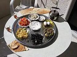 Eingeleitet wird das Abendessen, welches die eigentliche Hauptmahlzeit darstellt, mit verschiedenen Mezze. Diese kleinen Gerichte können cremige Pasten wie Hummus und Auberginenmus sein, werden über gegrilltes oder eingelegtes Gemüse mit Joghurtsoße gegeben, oder mit Brot von einem gemeinsamen Teller gedippt. Auch frische Salate aus Tomaten, Weizen und gehackter Petersilie, die Taboulé, gehören zu den Vorspeisen.