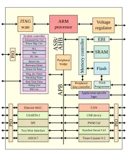 Welche weiteren Peripherieeinheiten integriert werden, hängt sehr stark von der eigentlichen Anwendung, aber natürlich auch von vielen weiteren Faktoren wie den beim Prozessortyp erwähnten Kriterien ab. Diese Peripherieblöcke hängen meist nicht direkt am Systembus, sondern über eine sogenannte Bridge an einem separaten Peripheriebus. Dieser ist meist deutlich langsamer getaktet, genügt jedoch den Anforderungen der meisten Peripherie. Somit wird in erster Linie neben einigen anderen positiven Effekten die kapazitive Belastung des Systembusses gesenkt, und dieser kann somit schneller getaktet werden, was natürlich nur so lange hilft, bis die CPU tatsächlich auf eine Peripherieeinheit warten muss; dann sind im Normalfall beide Busse belegt, ohne etwas zu übertragen. Zusätzlich erleichtert ein Peripheriebus die Entwicklung einfacherer Komponenten, da die Integration dieses Bustyps im Gegensatz zum Systembus in der Regel deutlich leichter fällt und durch seine oft kleinere Bitbreite und langsamere Taktung deutlich geringere Anforderungen stellt.
