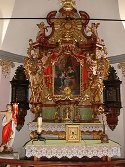 - Der Rokoko-Hauptaltar ist von 1753, die Seitenaltäre der hll. Nikolaus und Joseph von 1736 und die Kanzel von 1734.