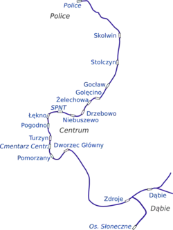 | (1) | Szczecin Główny ↔ Police Szczecin Pomorzany – Szczecin Cmentarz Centralny – Szczecin Turzyn – Szczecin Pogodno – Szczecin Łękno – Szczecin Niemierzyn – Szczecin Niebuszewo – Szczecin Drzetowo – Szczecin Żelechowa – Szczecin Golęcino – Szczecin Gocław – Szczecin Stołczyn – Szczecin Stołczyn Północny – Szczecin Skolwin – Szczecin Skolwin Północny – Police Dąbrówka |
