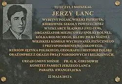 Im Jahre 1922 wurde Jerzy Lanc aus Kostkowice im Teschener Schlesien zum Leiter der polnischen Volksschule. Für die Erwachsene aus der Umgebung organisierte er auch Kurse der polnischen Sprache, Geographie und Geschichte Polens. Im Jahre 1930 richteten Polen im Abbau Lonk im masurischen Piasutno, damals deutschen Piassuten, eine Minderheitenschule ein, in der er ab 1931 als Lehrer unterrichtete. Es kam zu Spannungen zwischen Deutschen und Polen, die zwar durch Eingreifen der Regierung in Allenstein beendet werden konnten, aber nicht den – vielleicht sogar gewaltsamen – Tod von Jerzy Lanc verhinderten. Er wurde im evangelischen Friedhof in Szklarka Śląska begraben. Bis heute ist Lanc in der Gemeinde verehrt. Nach ihm wurden die Straßen in Sośnie, Olsztyn, Szczytno, Kętrzyn und Świętajno benannt.