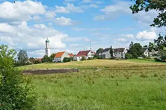 - Die Pfarrkirche Mariä Himmelfahrt und das um 1900 errichtete Pfarrhaus. Im 18. Jahrhundert war sie eine vielbesuchte Wallfahrtsstätte.[2]