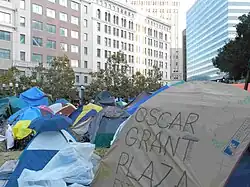 Im Rahmen der Occupy-Bewegung benannte Occupy Oakland die Frank Ogawa Plaza, wo die Protestierenden 2011 hr Zeltlager aufgestellt hatten, inoffiziell in Oscar Grant Plaza um.[13]