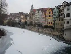 Mit der 1477 gegründeten Eberhard Karls Universität gehört die Stadt zu den ältesten deutschen Universitätsstädten. Das städtische Leben wird stark von den knapp 28.700 Studierenden (Stand: Wintersemester 2024/25)[2] geprägt. Tübingen ist daher mit einem Altersdurchschnitt von rund 40 Jahren eine der jüngsten Städte Deutschlands.[3]