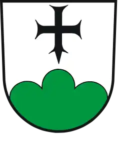 Blasonierung: „In Silber über grünem Dreiberg schwebend ein schwarzes Vortragskreuz.“