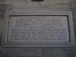 „DEI GENITRICIS ROSARIO INVOCATA SVFFRAGIA IN HVIVS FORTIS CIVITATIS FOSSIS IRRVENTES TVRCOS STITISSE IN PRAESENTI SOLI PONTIFEX INNOCENTIVS XI ATQVE AVGVSTVS LEOPOLDVS I PRIORE SIGNO NVPER EXEVNTIS BELLI IGNE RVPTO TESTATI HORTANTVR VOS VT PARIBVS ANGVSTIIS PRESSI PARI QVOQVE FERVORE SPERETIS IN ISTA POTENTI AVSTRIAE REGINA.“