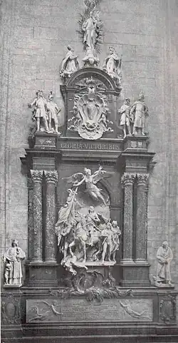 Das Denkmal wurde unter dem Südturm auf der Westseite in der Nähe vom Primtor aufgestellt. Es war aus Adneter Marmor hergestellt. Die einzelnen Teile waren aus dem Lienbach- und Rot-Scheck-Marmor aus den Steinbrüchen von Adnet angefertigt. Im Historismus mit barocken Stilelementen errichtet, glich es einem Altar der einen Triumphbogen enthielt. Über eine Predella standen vier korinthische Säulen die einen Bogen einrahmten. Im Bogen stand eine von Soldaten umgebene Reiterstatue und über deren Häuptern war ein Siegesengel angebracht. Über dem Bogen waren weitere Generäle dargestellt, über ihnen der Papst und der Kaiser, die auf die Statue der Muttergottes blickten, die das Denkmal krönte. In großen Lettern war Gloria Victoribus in das Gesims des Bogens eingemeißelt.