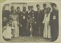 Eine Gruppe von Einwanderern, die meisten tragen das osmanische Fès und umgeben ein großes Gefäß, das mit einem Stern und dem Halbmond-Symbol des Islam und der osmanischen Türken dekoriert ist, 1902–1913