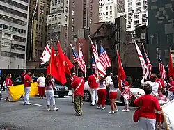 Türkische Amerikaner halten die Flaggen der Vereinigten Staaten und der Türkei.