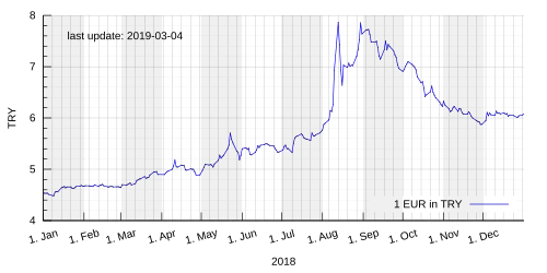 Die Türkische Währungs- und Schuldenkrise 2018 (türkisch Türkiye döviz ve borç krizi; auch Türkei-Krise oder Lira-Krise) ist eine Finanz- und Wirtschaftskrise in der Türkei. Sie zeichnet sich insbesondere durch eine Abwertung der Türkischen Lira (TRY), hohe Inflationsraten und Fremdkapitalkosten und entsprechende Kreditausfälle aus. Als Ursachen der Krise gelten das hohe Leistungsbilanzdefizit der türkischen Wirtschaft und private Fremdwährungsschulden sowie die umstrittene Zinspolitik.[1][2][3][4] Einige Analysten sehen auch Zusammenhänge zwischen der Krise und den diplomatischen Spannungen von USA und der Türkei.
