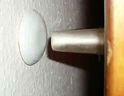 Türstopper können auch an der Wand befestigt sein, so dass die Tür mit dem Griff oder dem Türblatt gegen einen Klotz stößt. Im letztgenannten Fall werden meist kurze Stangen verwendet, die etwa die Tiefe des Türgriffes haben und am freien Ende einen Gummiklotz tragen. Sie werden meistens unauffällig und weniger störend im oberen Türbereich montiert.