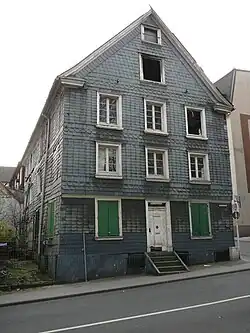 Das verschieferte Fachwerkgebäude aus der zweiten Hälfte des 18. Jahrhunderts[1] (nach einem Zeitungsbericht um das Jahr 1870[2]) war dreigeschossig und war vermutlich aus ehemals zwei selbständigen Gebäudeteilen unter einem gemeinsamen Satteldach zusammengefasst.