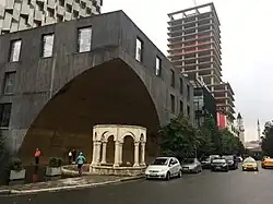 Eine Ecke des Gebäudesockels überragt die historische Kapllan-Pascha-Türbe, womit das denkmalgeschützte Grabmal durch diese Konstruktion vor einem Abbruch bewahrt werden konnte.[3]