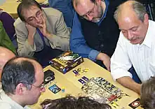 Inzwischen war die Zeit bis zur Nürnberger Spielwarenmesse bereits recht knapp geworden. Sternenhimmel war schon fertig, Klaus Teuber konnte Galopp Royal beisteuern und durch einen Anruf bei Stefan Dorra erhielt man Linie 1. Nur das vierte Spiel fehlte noch. Da mussten sich die vier TMler und Fritz Gruber (der von 1998 bis 2009 fünfter TM-Teilhaber war) selbst dransetzen und – aus mehr oder weniger bekannten Elementen – ein eigenes Spiel konstruieren. Bakschisch hieß das gar nicht so schlechte Ergebnis, ein Versteigerungsspiel, das unter dem „Autorenpseudonym“ Hering erschien. Dieser Hering war eine Figur gewesen, die innerhalb der Spiele Vernissage und Knock out eine Rolle spielte.