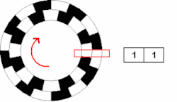 Zwischen der Leuchtdiode und zwei leicht versetzt angeordneten Photodetektoren befindet sich eine mit Schlitzen versehene Scheibe. Rotiert nun diese Scheibe, werden die beiden Photodetektoren abwechselnd beleuchtet. Aus diesen zwei Ausgangssignalen bildet der Empfänger die Drehrichtung und zählt die Impulse. Hochwertige Messsysteme benutzen vier Sensoren, die jeweils zu zweit antiparallel geschaltet sind, um einen definierten Nulldurchgang zu erhalten und so Drift- und Alterungserscheinungen zu kompensieren.