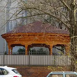 Die Eingangstüren des ehemaligen Gotteshauses sind Eigenanfertigungen mit Volkskunstmotiven. Das dreieckige Gelände wurde neu eingezäunt, wobei die vorhandene Mauer erhalten blieb, die an einigen Stellen im Beinbereich vergitterte Ausschnitte aufweist. Sie ist mit einem metallenen Zaunaufsatz erhöht worden, der Blick auf das frühere Kirchengebäude ist dadurch teilweise erhalten geblieben.[13] Zusätzlich wurde im Garten, hinter dem Zaun an der Perleberger Straße und dicht neben der Einfahrt, ein großer hölzerner geschnitzter Pavillon aufgestellt.
