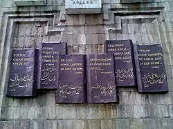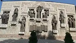 An einer Wand des Hauses befinden sich Statuen der berühmtesten persischen und tadschikischen Dichter: