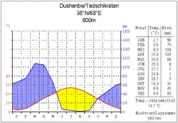 Tadschikistan befindet sich in der trockenen subtropischen Klimazone. Das Klima ist extrem kontinental mit kalten Wintern und heißen Sommern. Außer in den Tal- und Beckenländern, wo ein subtropisches feuchtes Klima herrscht, werden in den Sommermonaten Temperaturen von bis zu 45 °C erreicht. Es bestehen große Temperaturunterschiede zwischen den tiefer und den höher gelegenen Regionen des Landes. Die Jahresniederschlagsmengen sind relativ niedrig, so dass Steppenvegetation vorherrscht. Im Ferghanabecken beträgt die Niederschlagsmenge nur 140 mm im Jahr. Die Südhänge des Hissargebirges sind mit 1700 mm im Jahr dagegen sehr niederschlagsreich.