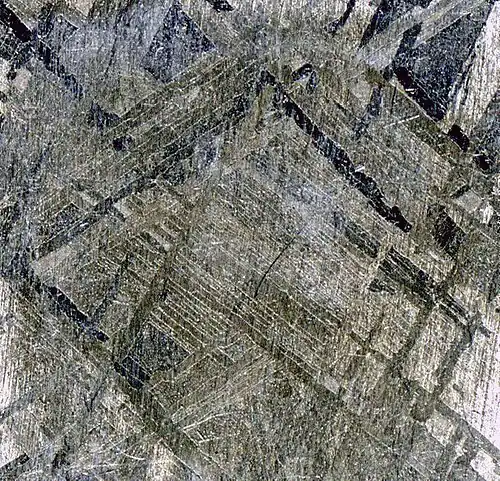 ![]() schmale, helle Streifen (gut erkennbar in der unteren Bildhälfte) sind Taenit-Bänder | |