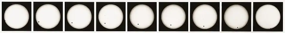 Eine klassische Beobachtungsmethode, um die Astronomische Einheit zu bestimmen, sind die – freilich sehr seltenen – Venusdurchgänge vor der Sonne. Als Sonderfall gehören sie zwar nicht zum Artikelthema, seien aber kurz erwähnt. Venustransits finden nur zweimal in ca. 120 Jahren statt, zuletzt im Juni 2004 und 2012. Die Vermessung der Venus erfolgt(e) dabei relativ zum Sonnenrand, wie die Bildserie zeigt.