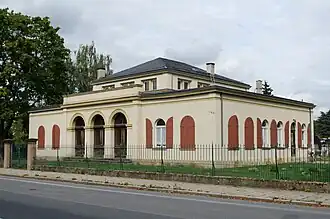 Der eingeschossige Massivbau über fast quadratischem Grundriss mit überhöhtem Mittelteil wurde in schlichten nachklassizistischen Formen errichtet.