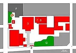 Man kann den Tempel durch das Westtor (西門 Saimon; im Plan 1) oder durch das einfache Südtor (南門 Nanmon; 2) betreten. Der Tempel umfasst nach dem Wiederaufbau neben der Haupthalle (本堂 Hondō; 3) den Glockenturm (鐘楼 Shōrō; 4), den kleinen Hakuryū Ōkami-Schrein (白龍大神; 5), den Pavillon für den Tempelgründer, die Daishidō (大師堂), den Fudō-Pavillon (不動堂), in dem der heilige Fudō (不動菩薩) verehrt wird, den Goma-Pavillon (護摩堂; 7), eine Schatzpagode (宝塔 Hōtō; 6), in der der heilige Dainichi (大日如来) verehrt wird, den Bereich für Pilgergäste, das Abt- und Mönchsquartier (本坊 Honbō; A) mit Speisesaal (庫裏). Im Süden erstreckt sich der „Neun-Berge–neun-Meere-Garten“ (九山九海庭 Kuzan kukai niwa; G).