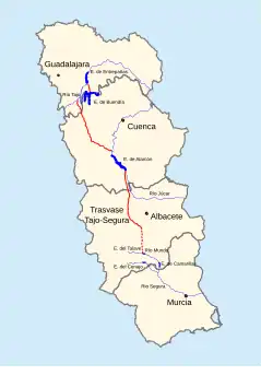 Der Kanal beginnt in der Region Kastilien-La Mancha am Bolarque-Staudamm, wo der Guadiela in den oberen Tajo mündet (40° 21′ 42″ N, 2° 49′ 13″ W). Er verläuft in überwiegend südlicher Richtung und endet in der Provinz Albacete im Talave-Stausee (38° 31′ 10″ N, 1° 54′ 0″ W) des Río Mundo, der später in den Río Segura mündet.