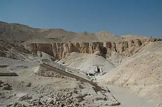 Im Tal der Könige sind insbesondere die Gräber der Herrscher des Neuen Reichs (ca. 1550 bis 1069 v. Chr.[3], 18. bis 20. Dynastie) zu finden. Das Tal befindet sich in Theben-West, gegenüber von Karnak, am Rand der Wüste und ist gesäumt von hohen Bergen, namentlich von der natürlichen Felspyramide el Korn oder el-Qurn („das Horn“). Nahezu das gesamte Gebiet von Theben-West bildet eine riesige Nekropole. Südlich davon liegt das Tal der Königinnen und dazwischen die Nekropolen Dra Abu el-Naga, el-Chocha, al-Asasif, Deir el-Bahari, Scheich Abd el-Qurna, Qurnet Murrai und Deir el-Medina mit den „Gräbern der Noblen“.
