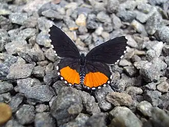 Die Flügelspannweite der Falter beträgt 30 bis 35 Millimeter, wobei Weibchen und Männchen ähnlich gezeichnet sind.[1] Die Grundfarbe der Flügeloberseiten bei beiden Geschlechtern ist schwarz. Auffällig ist die großflächige gelbrote bis orangegelbe Region, die sich vom Analwinkel auf der Hinterflügeloberseite bis zur Flügelmitte ausdehnt und die die Art unverwechselbar macht. Die Fransen sind abwechselnd schwarz und weiß gescheckt. Die Vorderflügelunterseite ist in der Submarginal- und Postdiskalregion schwarz gefärbt und mit weißen Flecken versehen, in der Diskal- und Basalregion weiß mit schwarzen Flecken. Die Hinterflügelunterseite ist in der Submarginal- und Postdiskalregion orangerot und mit weißen Flecken versehen sowie in der Diskal- und Basalregion weiß mit schwarzen Flecken. Die Hinterflügel zeigen sehr dünne schwarze Schwänzchen.