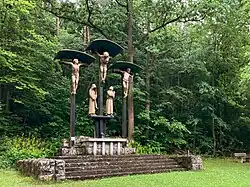 Auf der Wiese neben der Kirche befindet sich ein steinerner Freialtar, über dem sich eine überlebensgroße Kreuzigungsgruppe aus dem Jahre 1941 erhebt. Das Werk des Münchener Bildhauers Gottfried Albert stellt in expressivem Stil den gekreuzigten Christus, den Heiligen Johannes, Maria, die Mutter Jesu und die beiden Schächer dar.