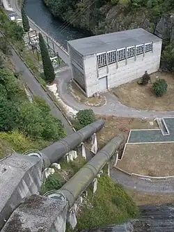 Die installierte Leistung des Kraftwerks beträgt 30[10] (bzw. 43[12] oder 43,2[11]) MW; es ging 1933[11] (bzw. 1944)[3] in Betrieb.[13][A 1] Jede der drei Turbinen des Kraftwerks leistet maximal 14,4 MW.[3][11] Das Maschinenhaus befindet sich ungefähr 300 m von der Staumauer entfernt auf der linken Flussseite.