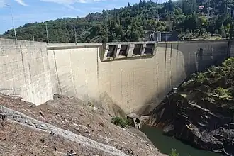 Das Absperrbauwerk ist eine Bogenstaumauer aus Beton mit einer Höhe von 75 m über der Gründungssohle. Die Mauerkrone liegt auf einer Höhe von 281 m über dem Meeresspiegel. Die Länge der Mauerkrone beträgt 284 m. Das Volumen des Bauwerks beträgt 93.000 m³.[1] Die Staumauer wurde von André Coyne und Jean Bellier entworfen.[2]