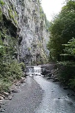 - Es ist aber auch denkbar, dass sich die Tamina unter dem härteren Kalk durchfrass und die Schlucht eigentlich eine Höhle ist. Die wichtigsten Aufschlüsse dazu an den Naturbrücken sind jedoch weder begeh- noch einsehbar.