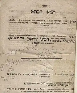 - ↑ "תניא" „ususally introduces a baraitha with the name of a tanna mentioned before the first statement“, Yitzhak Frank: The practical Talmud dictionary . Ariel, United Israel Institutes, Jerusalem 1991, S. 262. In den späteren Jahrhunderten wurde das wesentlich umfangreichere und anders gelagerte Buch Tanja von Schneur Salman, das heute sozusagen zur Chabad-Bibel geworden ist, wesentlich bekannter, so dass man zur klaren Unterscheidung das Ursprungswerk, das später auch modifiziert unter dem Titel Tanja Rabbati herausgegeben wurde, in der Folge immer als Tanja Rabbati bezeichnete.