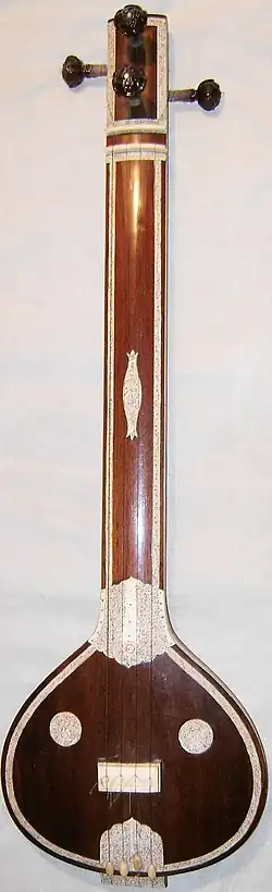 - ↑ Norbert Beyer: Tambūrā. II. Kunstmusiken. 1. Gestalt, Stimmung und Spieltechnik. In: Ludwig Finscher (Hrsg.): Die Musik in Geschichte und Gegenwart. Zweite Ausgabe, Sachteil, Band 9 (Sydney – Zypern). Bärenreiter/Metzler, Kassel u. a. 1998, ISBN 3-7618-1128-4 (Online-Ausgabe, für Vollzugriff Abonnement erforderlich)