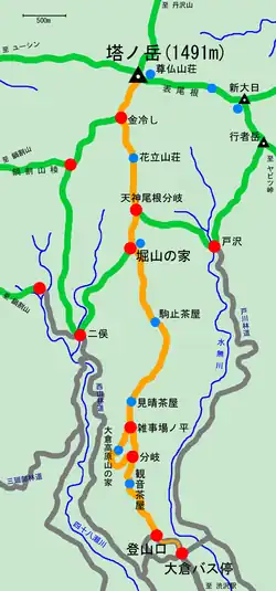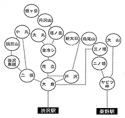 - Von Hadano aus geht der Aufstieg über den Yabitsu-Pass (矢櫃峠, Yabitsu tōge), Dann teilt sich der Weg: einer führt zum Ōyama, der andere ermöglicht über Ni-no-tō (二ノ等), San-no-tō (三ノ等) und den Toriiyama (鳥尾山) den Anschluss an die westlichen Berge.