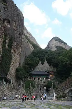 Der Einsiedler Yi Gap-yong (1860–1957) kam im Alter von 25 Jahren zum Maisan, um hier der Meditation nachgehen zu können. Während der nächsten Jahrzehnte errichtete er um die 120 Steinpagoden ohne Mörtel oder einen ähnlichen Befestigungsstoff. Die Steingebilde, die teilweise eine Höhe von 10 Metern besitzen, errichtete er ohne technische Hilfsmittel. Die Pagoden trotzen bis heute jedem Wind und Wetter.