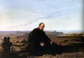 Zwei Tage nach der Verurteilung wurde er in Begleitung eines Polizisten nach Orenburg überstellt,[24] wo er am 1. Juni 1847 eintraf und gleich zur Festung Orsk verlegt wurde. Dort am 8. Juni 1847 angekommen, verbrachte er als Soldat die erste Zeit seiner Verbannung.[41][33] Nach einiger Zeit wurde ihm, unterstützt von den Offizieren seiner Militäreinheit, erlaubt, in Orenburg zu leben und Zivilkleidung zu tragen. Von Oktober 1848 bis Mai 1849 nahm er unter der Leitung von Alexei Butakow an einer Expedition zur Erkundung des Aralsees teil, bei der ihm die Aufgabe zufiel, die erforschten Landschaften für wissenschaftliche Zwecke zu skizzieren. Durch dieses Umgehen des Malverbotes konnte Schewtschenko 200 Gemälde und Skizzen anfertigen.[42] Während der Expedition beschrieb Alexei Butakow erstmals eine Bucht des Nördlichen Aralsees, die er Paskewitsch-Bucht nannte und die 1961 in Schewtschenko-Bucht umbenannt wurde.[43] In Orenburg lernte er die ebenfalls dorthin verbannten Edward Żeligowski und Bronisław Zaleski kennen, denen er noch über Jahre hinweg freundschaftlich verbunden blieb.[44][45] Nachdem er so einige Monate in relativer Freiheit leben konnte, wurde er von einem Leutnant denunziert, Zivilkleidung zu tragen und heimlich zu dichten und zu malen.[24] Am 27. April 1850 wurde er deshalb erneut verhaftet und nach einem einwöchigen Prozess in einen noch abgelegeneren Außenposten verbannt: die Festung Nowopetrowsk, das heutige Fort Schewtschenko am Kaspischen Meer.[11] Von dort aus nahm er zwischen dem 28. Mai und dem 7. September 1851[46] als Künstler an der Karatau-Expedition teil, wo er erneut Gelegenheit zum Zeichnen erhielt.[26] Trotz des Schreib- und Malverbots entstanden in dieser Zeit Dichtungen, die unter Pseudonym von Freunden veröffentlicht wurden, sowie Gemälde, die er sogar verkaufen konnte.