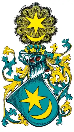 Blasonierung: In Blau ein goldener aufwärtsgekehrter Halbmond, darüber ein goldener Stern (Polnisches Wappen Leliwa). Auf dem gekrönten Helm mit blau-goldenen Helmdecken ein Pfauenschweif belegt mit dem Wappenbild.