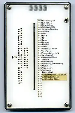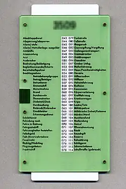 Die Verschlüsselung von Einsatzstichwörtern erfolgte durch die mit der Caesar-Verschlüsselung gekoppelte Zuordnung jeweils einer Zahl aus drei Ziffern in Sichtfenstern zu den aufgedruckten Begriffen. Die dem Begriff zugeordnete Zahl wurde einfach abgelesen. Entsprechend konnte ein Ereignis wie „Verkehrsunfall“ mit der aktuellen Zahl aus 26 möglichen Werten ausgedrückt werden. (Bei Einstellung wie auf dem oben abgebildeten Tarnschieber wäre dies „069“ gewesen.)