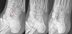 Häufigste Form der tarsalen Koalition, die kalkaneonavikulare Koalition im schrägen Röntgenbild des Fußes (links, Pfeile) mit zwei diesbezüglich unauffälligen Vergleichsfüßen. Die Koalition ist nicht knöchern, sondern bindegewebig oder knorpelig.