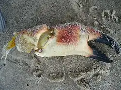 Der Taschenkrebs ist die einzige Krabbe in der Nordsee, die im größeren Umfang gefischt wird.[2][8] Die im Norden Deutschlands überall als Nordseekrabbe oder kurz Krabbe bezeichnete Nordseegarnele gehört eigentlich nicht zu den Krabben (Kurzschwanzkrebse), sondern zu den Garnelen, die früher wegen ihrer Gestalt zu den Langschwanzkrebsen gezählt wurden.