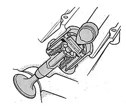 Tassenstößel gleiten in einer zylindrischen Führung im Zylinderkopf in axialer Richtung des Ventils oberhalb der Ein- und Auslassventile. Sie nehmen dabei die von der Nockenwelle ausgehende Kraft in Richtung des Ventils auf und übertragen sie auf das Ventil. Der Nocken gleitet bei seiner Drehung auf der Stößeloberfläche, so dass Querkräfte senkrecht zum Ventilschaft zuverlässig ferngehalten werden. Geschlossen wird das Ventil im Anschluss an seine maximale Öffnung durch eine Ventilfeder.