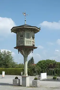 Das geschnitzte und bemalte Taubenhaus steht auf einem circa drei Meter hohen Pfeiler. Auf dem Dach erhebt sich eine Wetterfahne.