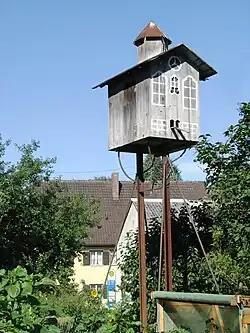 Das Taubenhaus aus Holz hat das Aussehen eines palaisartigen Hauses. Es steht auf circa drei Meter hohen Eisenstangen. Auf dem Satteldach sitzt ein achteckiger Dachreiter.