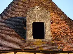 Der runde Taubenturm aus Hausteinmauerwerk besitzt ein Dach mit flachen Ziegeln. Zwei Dachgauben mit Dreiecksgiebel bildeten den Zugang für die Tauben. Im Taubenturm wurde eine Zwischendecke eingezogen, um das Bauwerk als Getreidespeicher zu nutzen.[1]